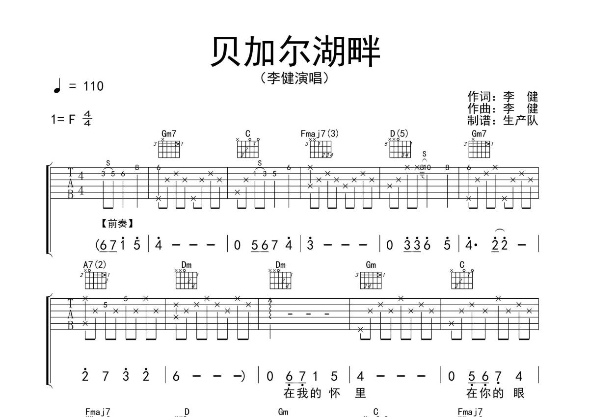 《贝加尔湖畔》是李健演唱的一首歌曲,拍号为4/4拍,歌曲速度为每分钟110拍,歌曲原调为F调,但由于原调指法比较难,为了方便弹奏,本吉他谱采用的是F调指法编配,演奏时不需要使用变调夹即为原调,这份吉他谱共有四张高清图谱,图谱由 @生产队 编配上传,图谱使用六线谱编配,包含吉他和弦指法、简谱以及歌词部分,使用这份贝加尔湖畔吉他谱,可以让你更加方便地掌握这首歌曲的弹唱技巧,快来尝试吧。