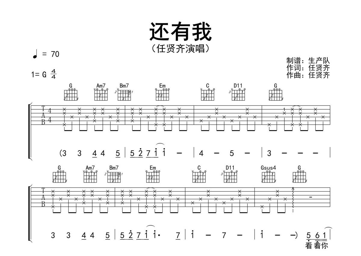 《还有我》是任贤齐演唱的一首歌曲,拍号为4/4拍,歌曲速度为每分钟70拍,歌曲原调为G调,本吉他谱采用的是G调指法编配,演奏时不需要使用变调夹即为原调,这份吉他谱共有三张高清图谱,图谱由 @生产队 编配上传,图谱使用六线谱编配,包含吉他和弦指法、简谱以及歌词部分,使用这份还有我吉他谱,可以让你更加方便地掌握这首歌曲的弹唱技巧,快来尝试吧。