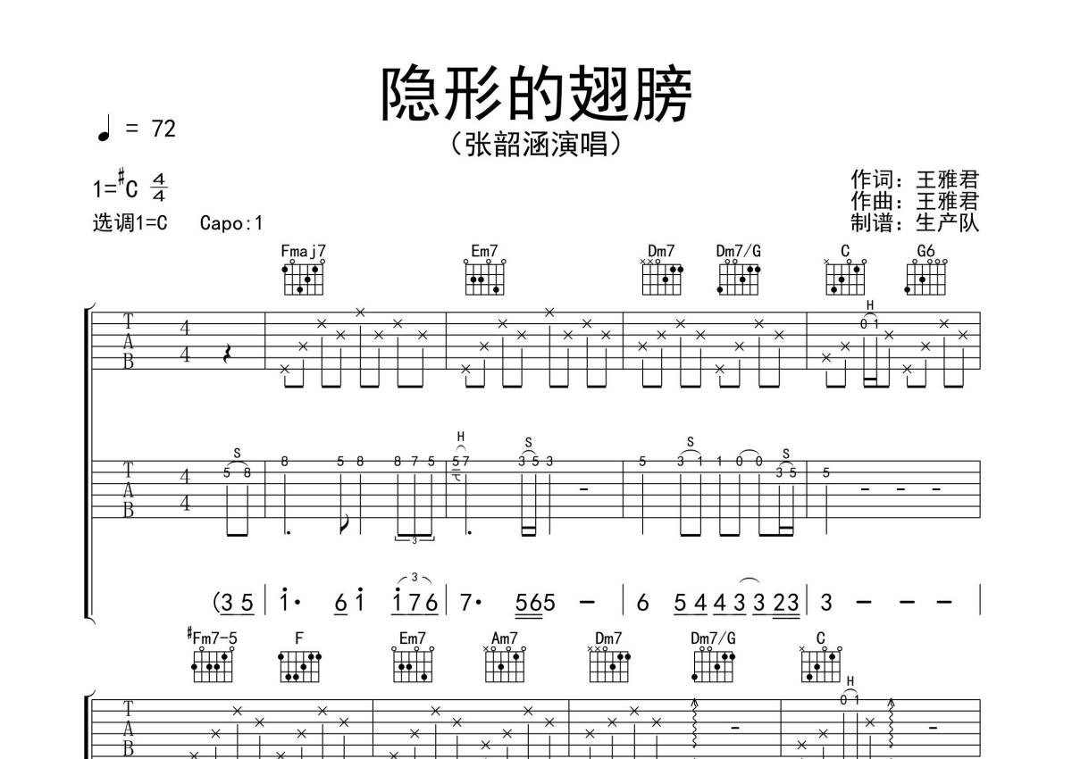 《隐形的翅膀》是张韶涵演唱的一首歌曲,拍号为4/4拍,歌曲速度为每分钟72拍,歌曲原调为Db调,但由于原调指法比较难,为了方便弹奏,本吉他谱采用的是C调指法编配,变调夹1品弹奏即为原调,当然也可以根据自己的音域改变变调夹位置,或者通过改变和弦调性,以方便自己弹奏,这份吉他谱共有三张高清图谱,图谱由 @生产队 编配上传,图谱使用六线谱编配,包含吉他和弦指法、简谱以及歌词部分,使用这份隐形的翅膀吉他谱,可以让你更加方便地掌握这首歌曲的弹唱技巧,快来尝试吧。