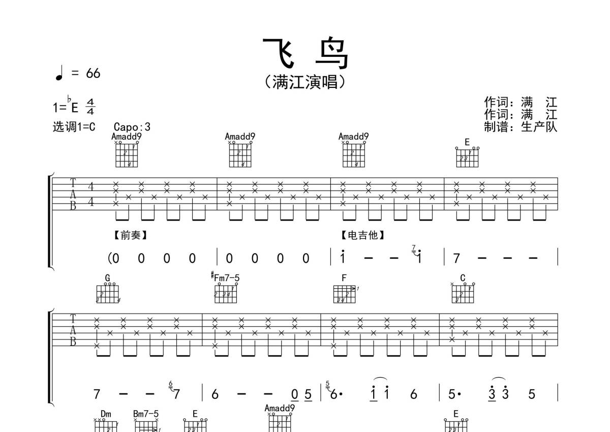《飞鸟》是满江演唱的一首歌曲,拍号为4/4拍,歌曲速度为每分钟66拍,歌曲原调为Eb调,但由于原调指法比较难,为了方便弹奏,本吉他谱采用的是C调指法编配,变调夹3品弹奏即为原调,当然也可以根据自己的音域改变变调夹位置,或者通过改变和弦调性,以方便自己弹奏,这份吉他谱共有四张高清图谱,图谱由 @生产队 编配上传,图谱使用六线谱编配,包含吉他和弦指法、简谱以及歌词部分,使用这份飞鸟吉他谱,可以让你更加方便地掌握这首歌曲的弹唱技巧,快来尝试吧。