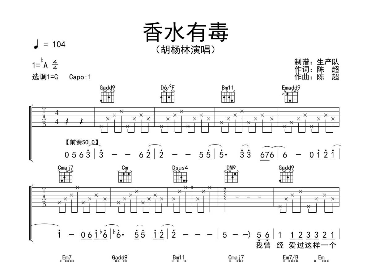 《香水有毒》是胡杨林演唱的一首歌曲,拍号为4/4拍,歌曲速度为每分钟104拍,歌曲原调为Ab调,但由于原调指法比较难,为了方便弹奏,本吉他谱采用的是G调指法编配,变调夹1品弹奏即为原调,当然也可以根据自己的音域改变变调夹位置,或者通过改变和弦调性,以方便自己弹奏,这份吉他谱共有三张高清图谱,图谱由 @生产队 编配上传,图谱使用六线谱编配,包含吉他和弦指法、简谱以及歌词部分,使用这份香水有毒吉他谱,可以让你更加方便地掌握这首歌曲的弹唱技巧,快来尝试吧。