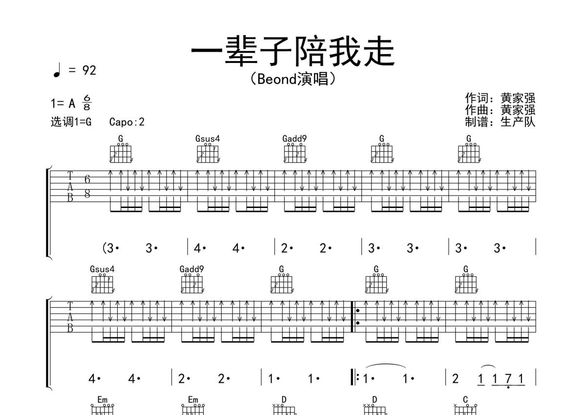 《一辈子陪我走》是Beyond演唱的一首歌曲,拍号为6/8拍,歌曲速度为每分钟92拍,歌曲原调为A调,但由于原调指法比较难,为了方便弹奏,本吉他谱采用的是G调指法编配,变调夹2品弹奏即为原调,当然也可以根据自己的音域改变变调夹位置,或者通过改变和弦调性,以方便自己弹奏,这份吉他谱共有四张高清图谱,图谱由 @生产队 编配上传,图谱使用六线谱编配,包含吉他和弦指法、简谱以及歌词部分,使用这份一辈子陪我走吉他谱,可以让你更加方便地掌握这首歌曲的弹唱技巧,快来尝试吧。