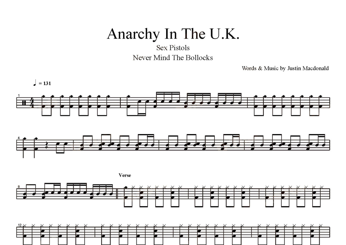 《Anarchy in the U.K.》是Sex Pistols演唱的一首歌曲,这份鼓谱共有四张高清图谱,图谱由 @打鼓谱 编配上传,图谱使用五线谱编配,使用这份Anarchy in the U.K.架子鼓谱,你将能够轻松地敲打出这首Sex Pistols的Anarchy in the U.K.,快来尝试吧。《Anarchy in the U.K.》现场版。性手枪是英国最有影响的朋克摇滚乐队之一,虽然他们存在的时间非常短。这句著名的“这里没有未来”几乎成为所有朋克人民的呼吁口号,性手枪乐队可谓声名大噪。