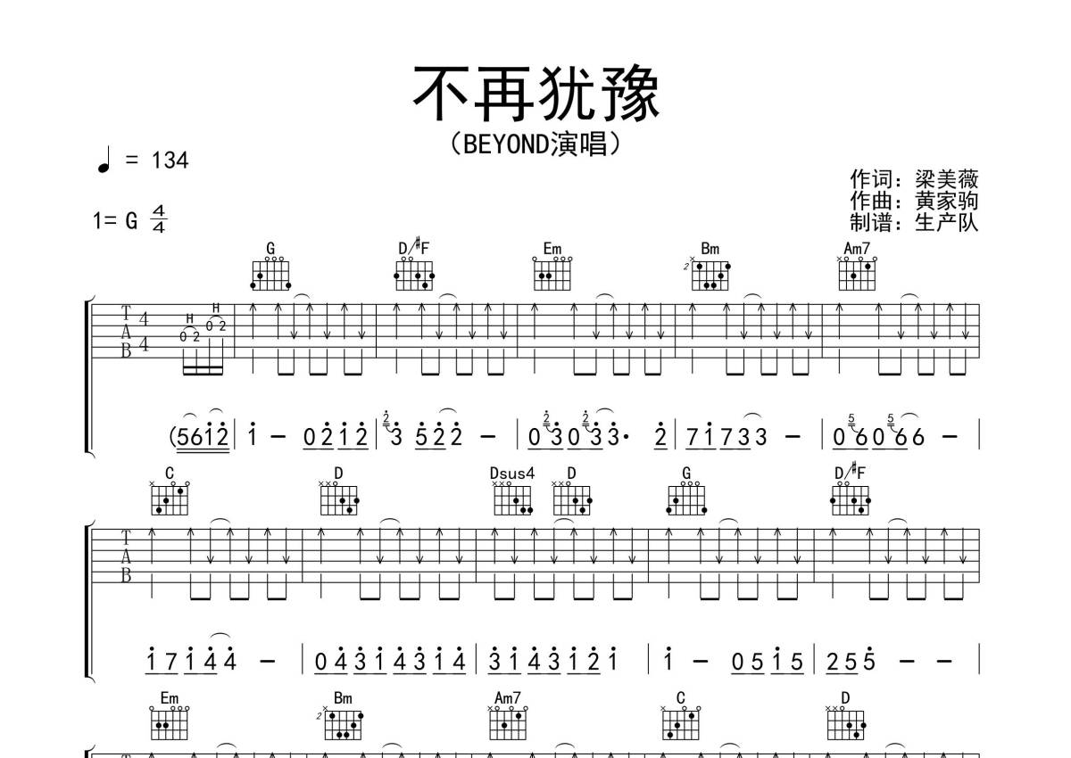 《不再犹豫》是BEYOND演唱的一首歌曲,拍号为4/4拍,歌曲速度为每分钟134拍,歌曲原调为G调,本吉他谱采用的是G调指法编配,演奏时不需要使用变调夹即为原调,这份吉他谱共有四张高清图谱,图谱由 @生产队 编配上传,图谱使用六线谱编配,包含吉他和弦指法、简谱以及歌词部分,使用这份不再犹豫吉他谱,可以让你更加方便地掌握这首歌曲的弹唱技巧,快来尝试吧。