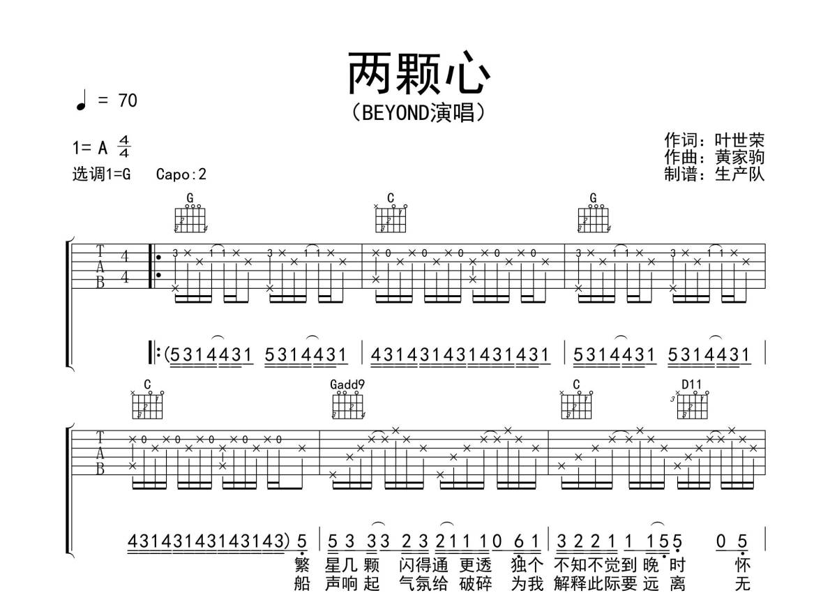 Beyond《两颗心》吉他谱 - G调弹唱六线谱