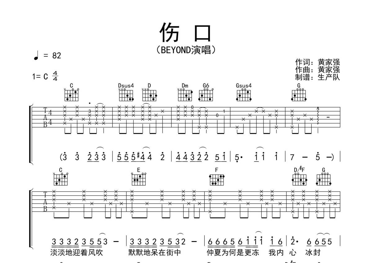 Beyond《伤口》吉他谱 - C调弹唱六线谱