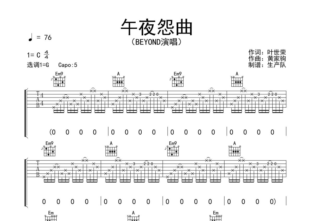 《午夜怨曲》是Beyond演唱的一首歌曲,拍号为4/4拍,歌曲速度为每分钟76拍,歌曲原调为C调,本吉他谱采用的是G调指法编配,变调夹5品弹奏即为原调,当然也可以根据自己的音域改变变调夹位置,或者通过改变和弦调性,以方便自己弹奏,这份吉他谱共有四张高清图谱,图谱由 @生产队 编配上传,图谱使用六线谱编配,包含吉他和弦指法、简谱以及歌词部分,使用这份午夜怨曲吉他谱,可以让你更加方便地掌握这首歌曲的弹唱技巧,快来尝试吧。