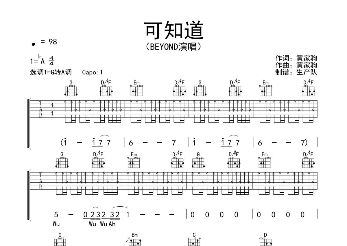 《可知道》是Beyond演唱的一首歌曲,拍号为4/4拍,歌曲速度为每分钟98拍,歌曲原调为Ab调,但由于原调指法比较难,为了方便弹奏,本吉他谱采用的是G调指法编配,变调夹1品弹奏即为原调,当然也可以根据自己的音域改变变调夹位置,或者通过改变和弦调性,以方便自己弹奏,这份吉他谱共有四张高清图谱,图谱由 @生产队 编配上传,图谱使用六线谱编配,包含吉他和弦指法、简谱以及歌词部分,使用这份可知道吉他谱,可以让你更加方便地掌握这首歌曲的弹唱技巧,快来尝试吧。