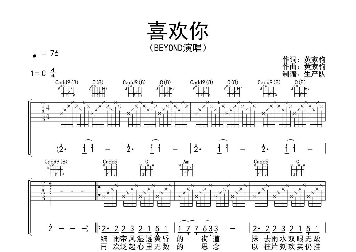 Beyond《喜欢你》吉他谱 - C调弹唱六线谱
