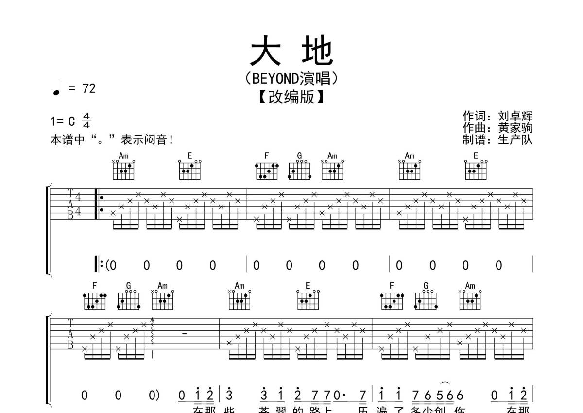 Beyond《大地》吉他谱 - C调弹唱六线谱