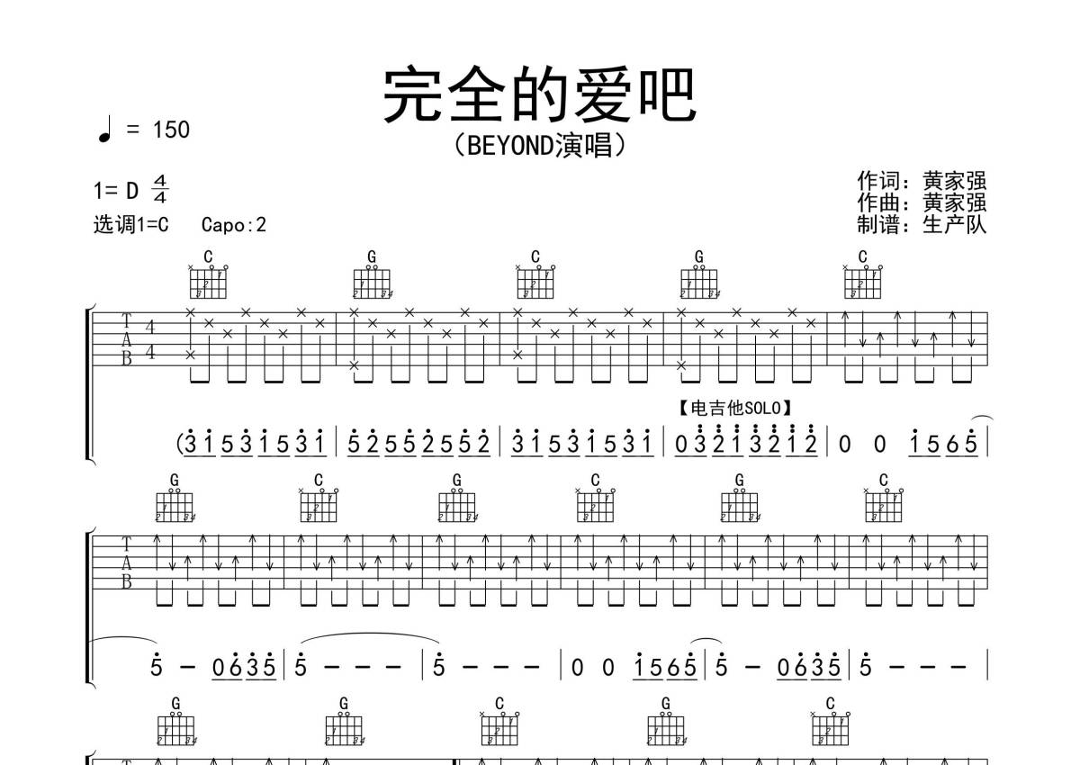 《完全的爱吧》是Beyond演唱的一首歌曲,拍号为4/4拍,歌曲速度为每分钟150拍,歌曲原调为D调,但由于原调指法比较难,为了方便弹奏,本吉他谱采用的是C调指法编配,变调夹2品弹奏即为原调,当然也可以根据自己的音域改变变调夹位置,或者通过改变和弦调性,以方便自己弹奏,这份吉他谱共有四张高清图谱,图谱由 @生产队 编配上传,图谱使用六线谱编配,包含吉他和弦指法、简谱以及歌词部分,使用这份完全的爱吧吉他谱,可以让你更加方便地掌握这首歌曲的弹唱技巧,快来尝试吧。