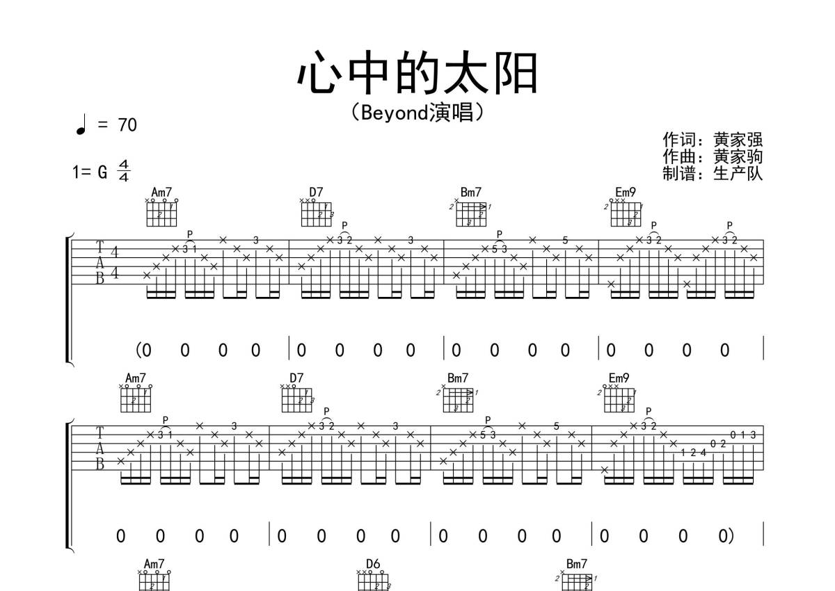 Beyond《心中的太阳》吉他谱 - G调弹唱六线谱