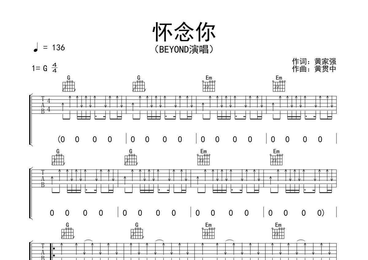 Beyond《怀念你》吉他谱 - G调弹唱六线谱