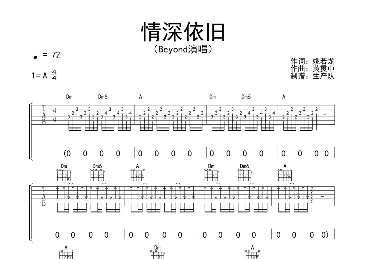 Beyond《情深依旧》吉他谱 - A调弹唱六线谱