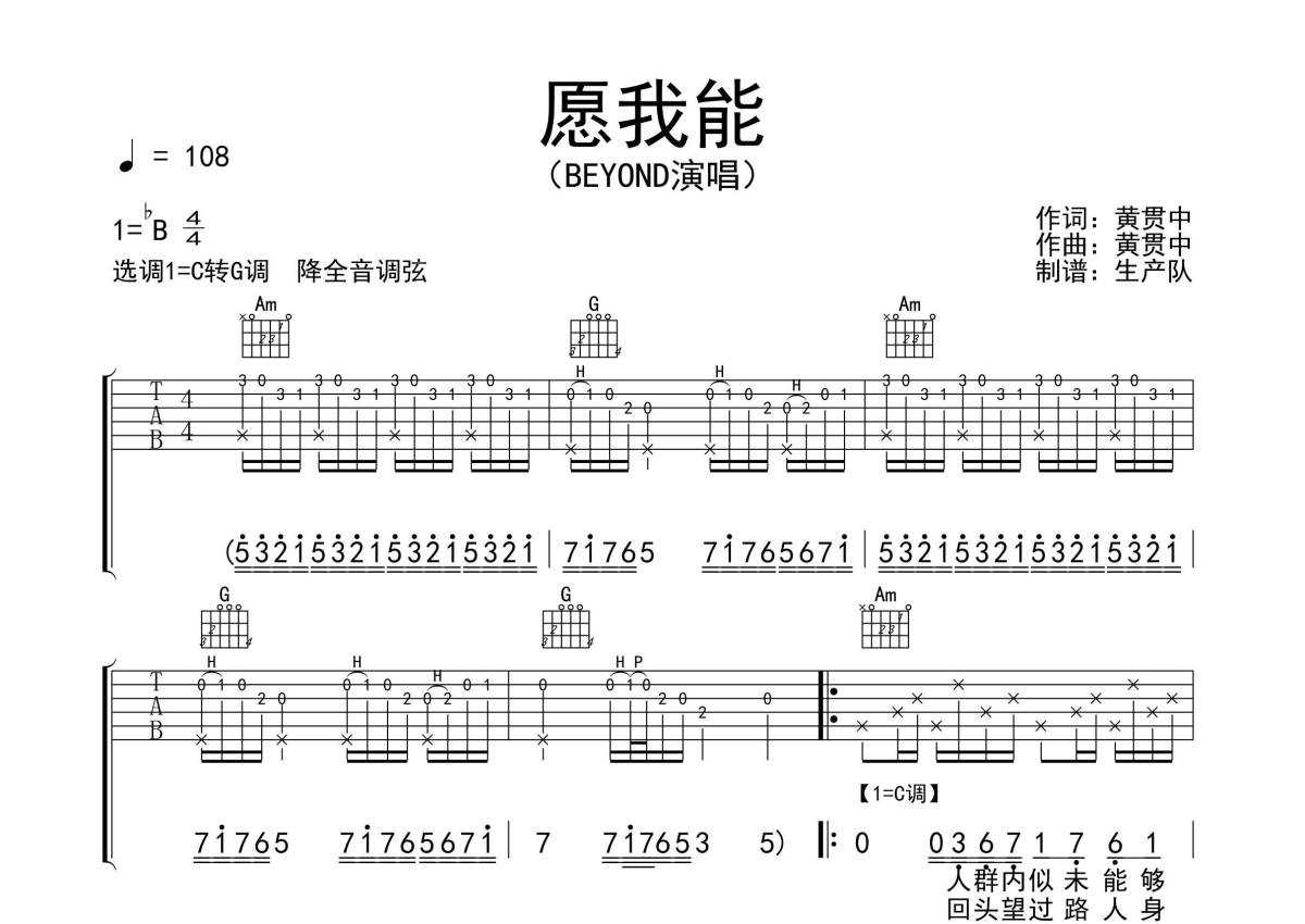 《愿我能》是Beyond演唱的一首歌曲,拍号为4/4拍,歌曲速度为每分钟108拍,歌曲原调为Bb调,但由于原调指法比较难,为了方便弹奏,本吉他谱采用的是C调指法编配,这份吉他谱共有三张高清图谱,图谱由 @生产队 编配上传,图谱使用六线谱编配,包含吉他和弦指法、简谱以及歌词部分,使用这份愿我能吉他谱,可以让你更加方便地掌握这首歌曲的弹唱技巧,快来尝试吧。