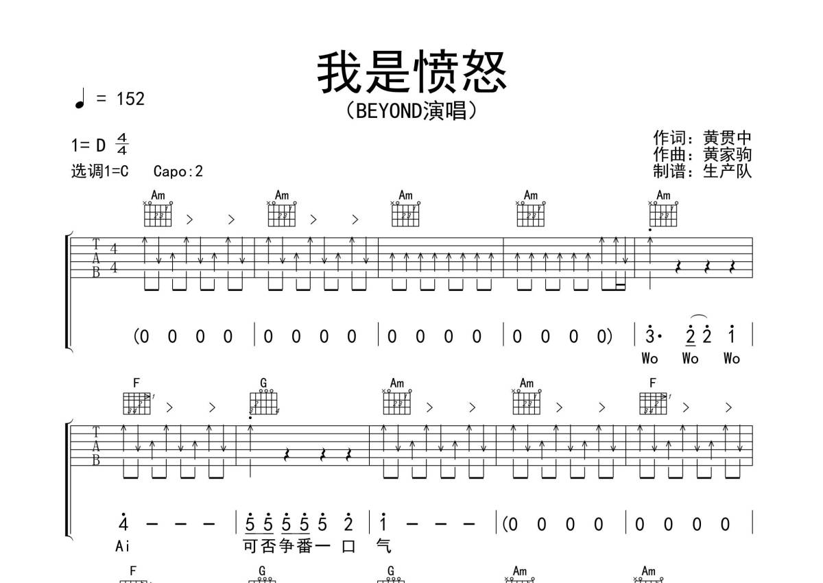 Beyond《我是愤怒》吉他谱 - C调弹唱六线谱