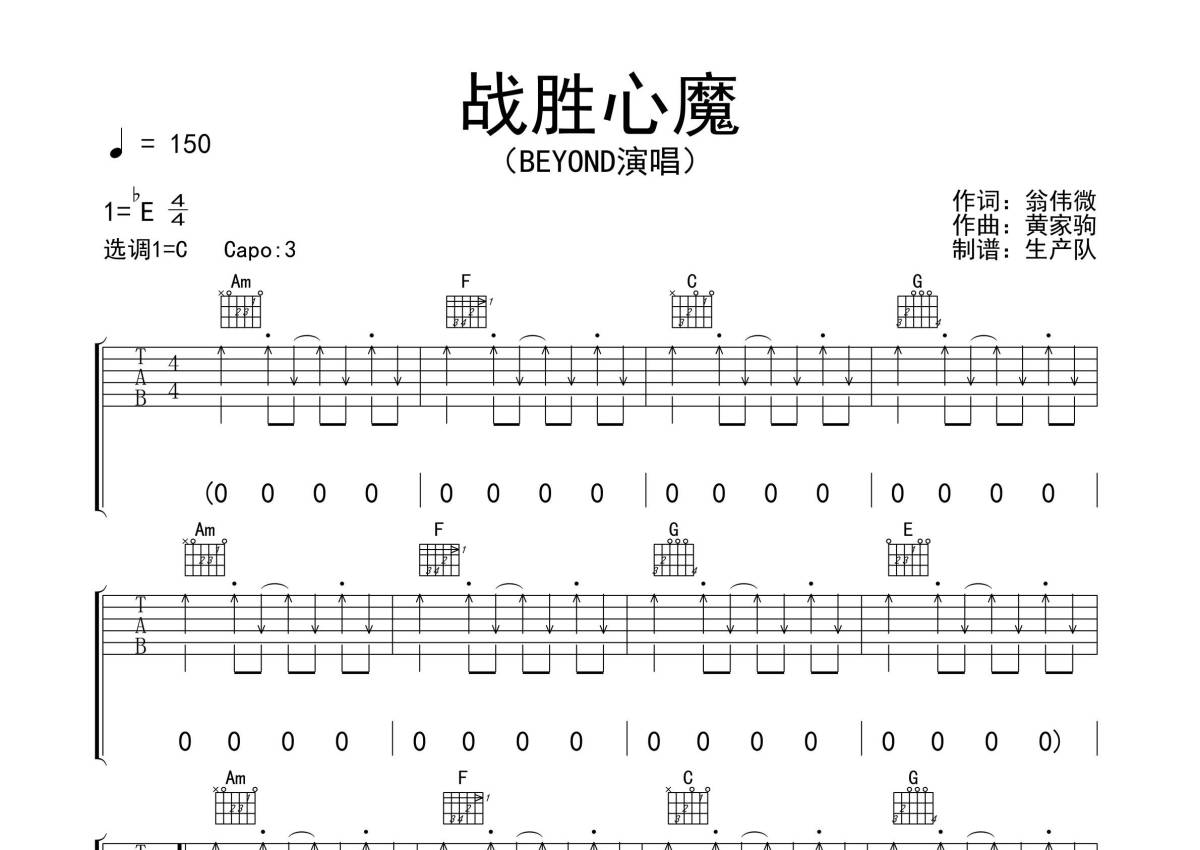 《战胜心魔》是BEYOND演唱的一首歌曲,拍号为4/4拍,歌曲速度为每分钟150拍,歌曲原调为Eb调,但由于原调指法比较难,为了方便弹奏,本吉他谱采用的是C调指法编配,变调夹3品弹奏即为原调,当然也可以根据自己的音域改变变调夹位置,或者通过改变和弦调性,以方便自己弹奏,这份吉他谱共有三张高清图谱,图谱由 @生产队 编配上传,图谱使用六线谱编配,包含吉他和弦指法、简谱以及歌词部分,使用这份战胜心魔吉他谱,可以让你更加方便地掌握这首歌曲的弹唱技巧,快来尝试吧。