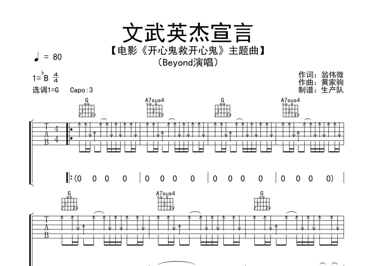 Beyond《文武英杰宣言》吉他谱 - G调弹唱六线谱