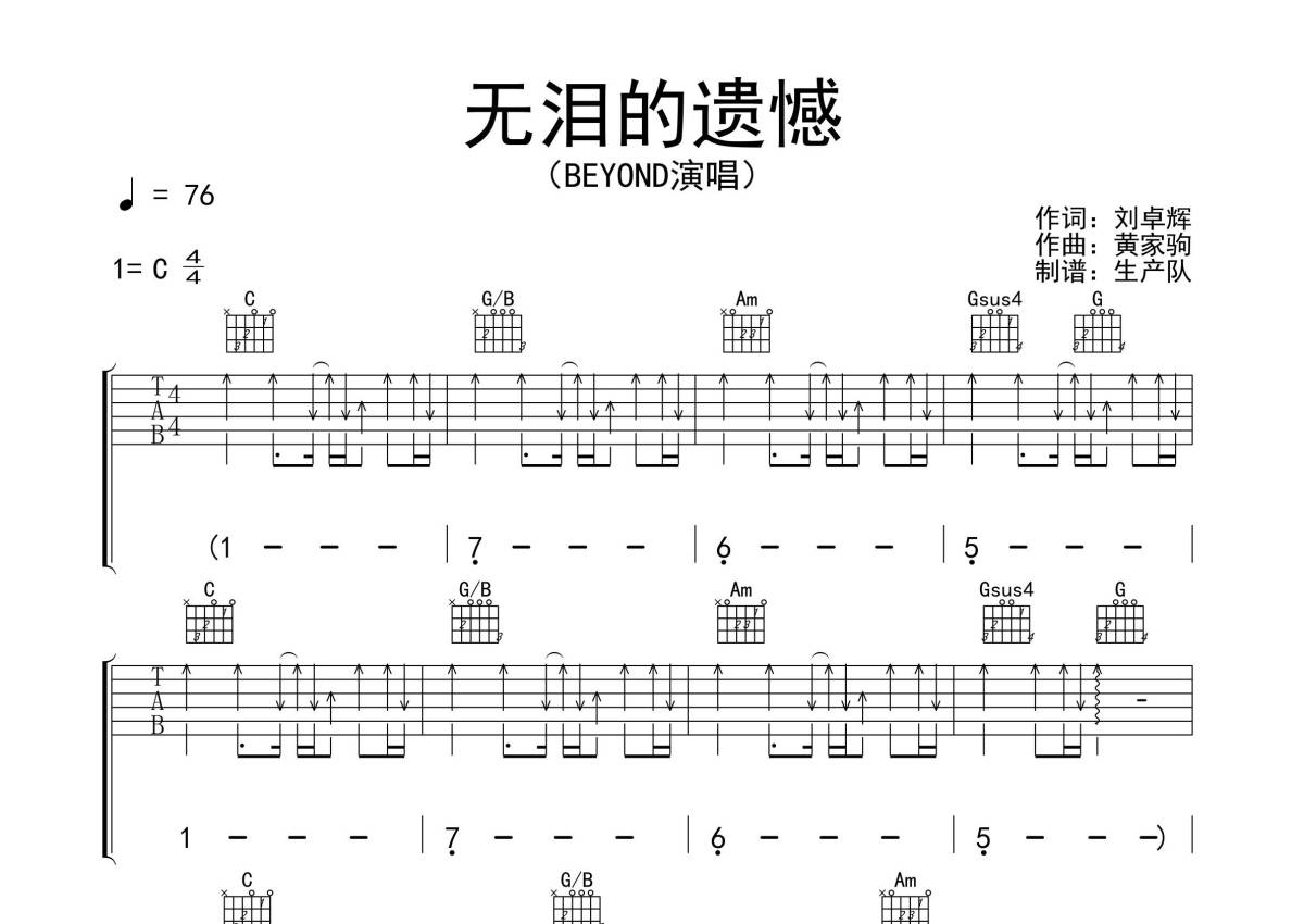 Beyond《无泪的遗憾》吉他谱 - C调弹唱六线谱