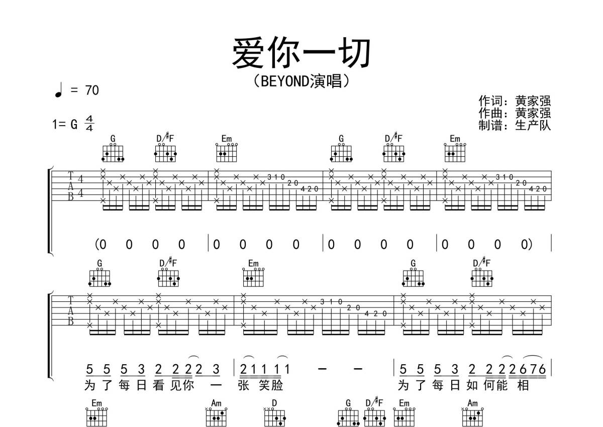 Beyond《爱你一切》吉他谱 - G调弹唱六线谱