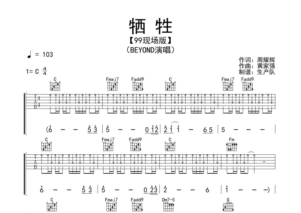 《牺牲》是Beyond演唱的一首歌曲,拍号为4/4拍,歌曲速度为每分钟103拍,歌曲原调为C调,本吉他谱采用的是C调指法编配,演奏时不需要使用变调夹即为原调,这份吉他谱共有三张高清图谱,图谱由 @生产队 编配上传,图谱使用六线谱编配,包含吉他和弦指法、简谱以及歌词部分,使用这份牺牲吉他谱,可以让你更加方便地掌握这首歌曲的弹唱技巧,快来尝试吧。