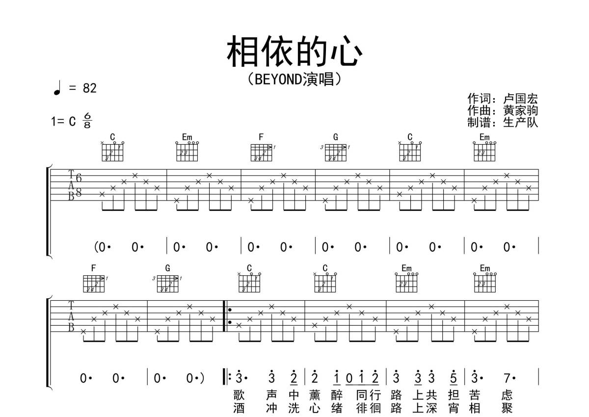 Beyond《相依的心》吉他谱 - C调弹唱六线谱