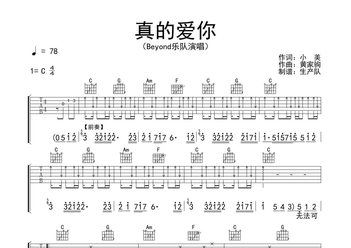 Beyond《真的爱你》吉他谱 - C调弹唱六线谱