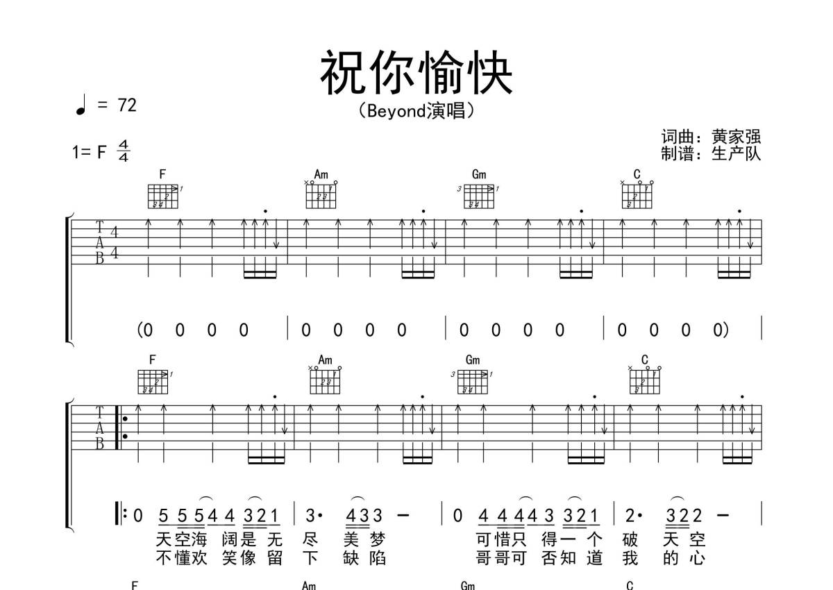 Beyond《祝你愉快》吉他谱 - F调弹唱六线谱