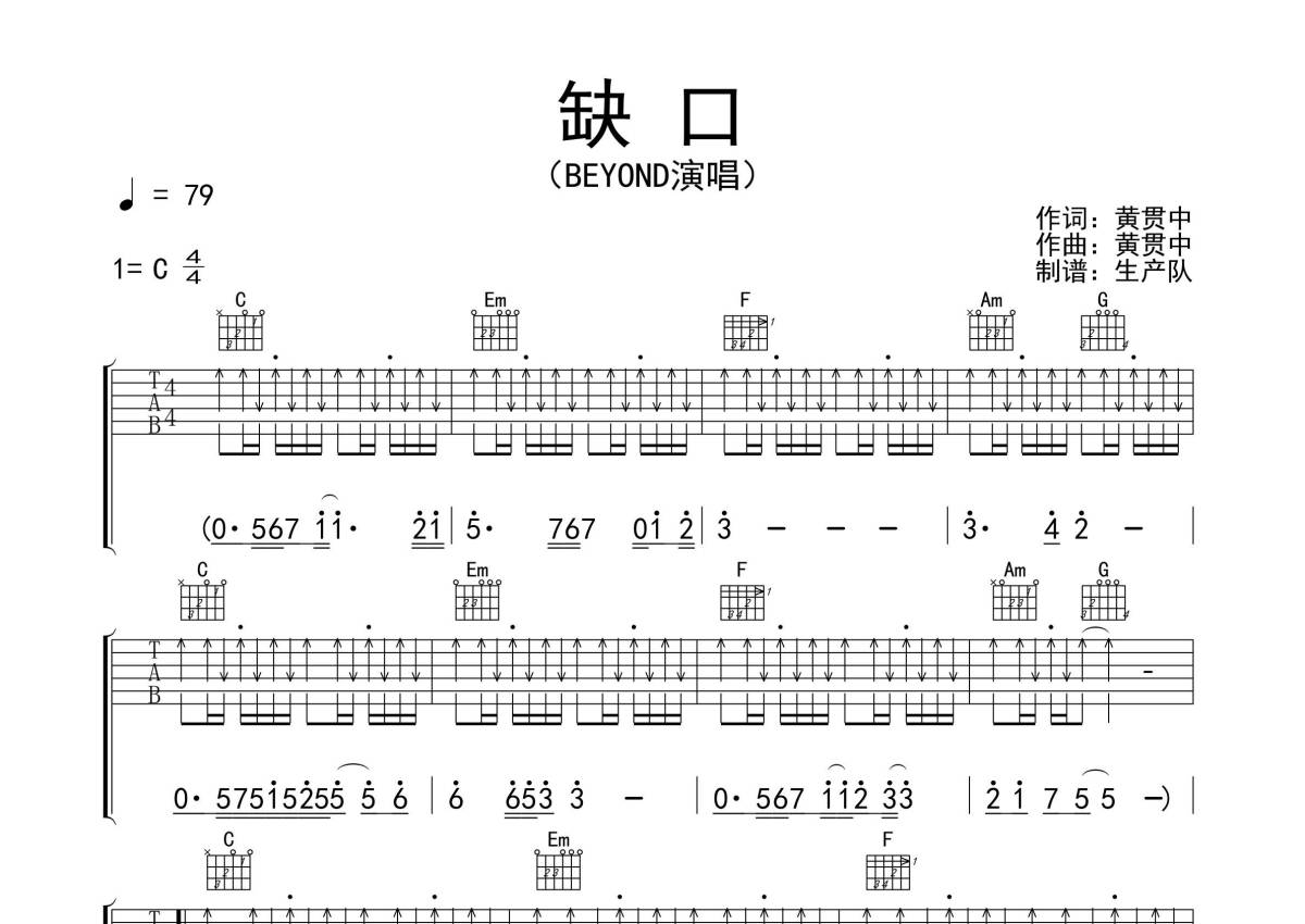 Beyond《缺口》吉他谱 - C调弹唱六线谱
