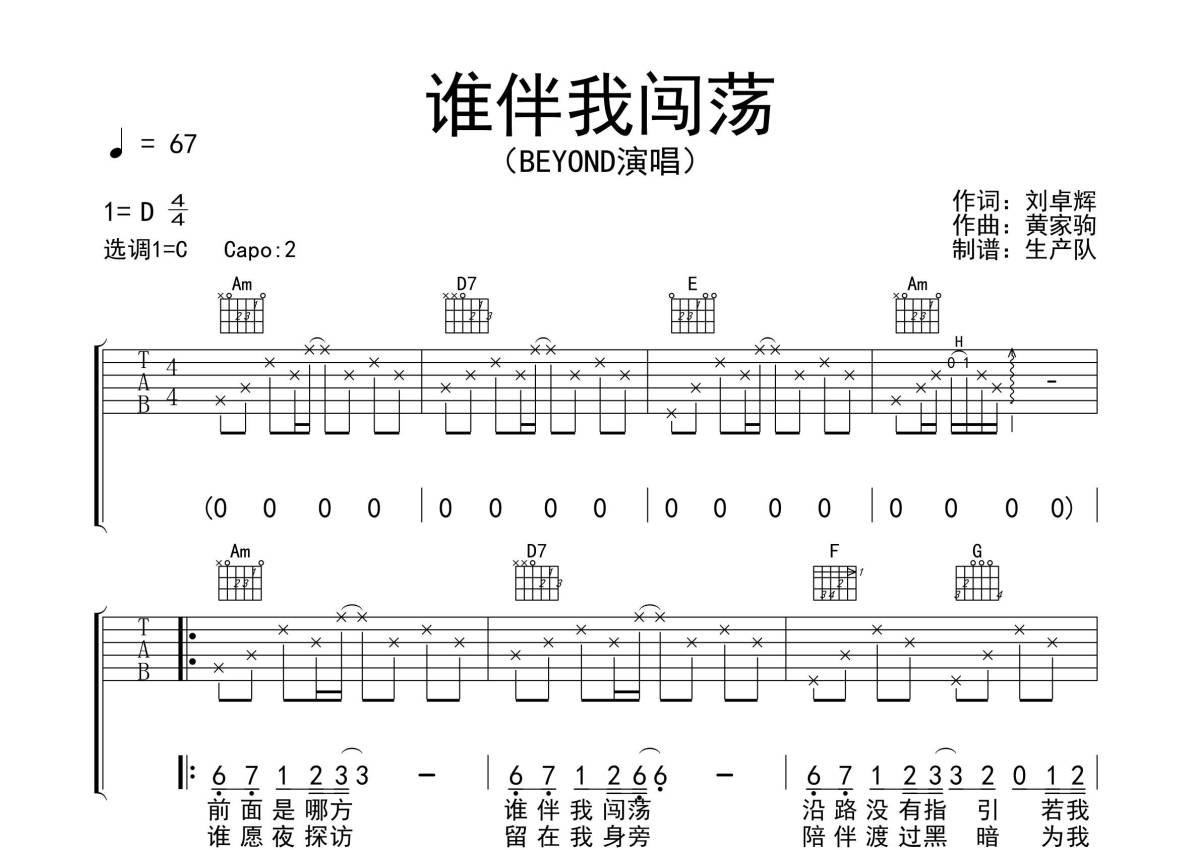 《谁伴我闯荡》是Beyond演唱的一首歌曲,拍号为4/4拍,歌曲速度为每分钟67拍,歌曲原调为D调,但由于原调指法比较难,为了方便弹奏,本吉他谱采用的是C调指法编配,变调夹2品弹奏即为原调,当然也可以根据自己的音域改变变调夹位置,或者通过改变和弦调性,以方便自己弹奏,这份吉他谱共有三张高清图谱,图谱由 @生产队 编配上传,图谱使用六线谱编配,包含吉他和弦指法、简谱以及歌词部分,使用这份谁伴我闯荡吉他谱,可以让你更加方便地掌握这首歌曲的弹唱技巧,快来尝试吧。