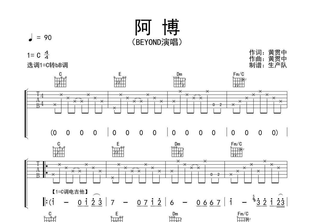 BEYOND《阿博》吉他谱 - C调弹唱六线谱