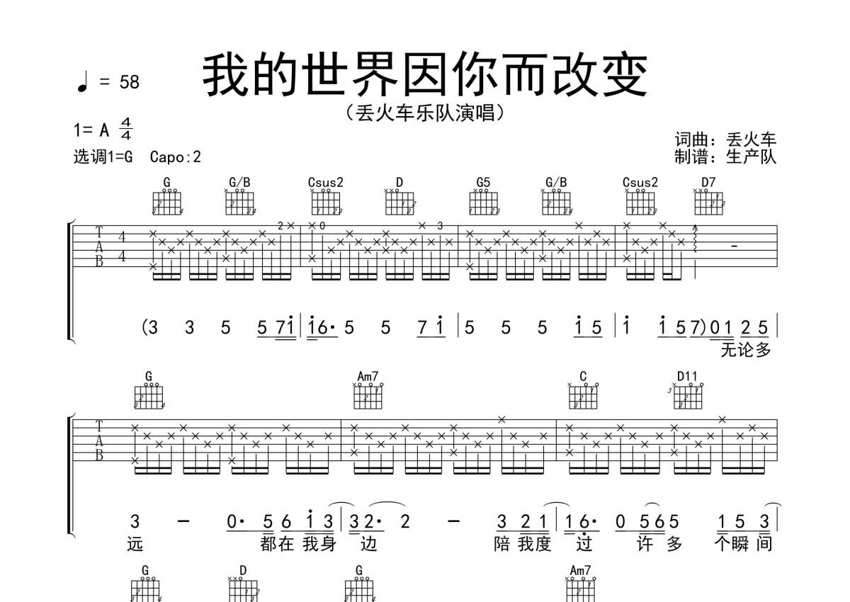 丢火车乐队《我的世界因你而改变》吉他谱 - G调弹唱六线谱