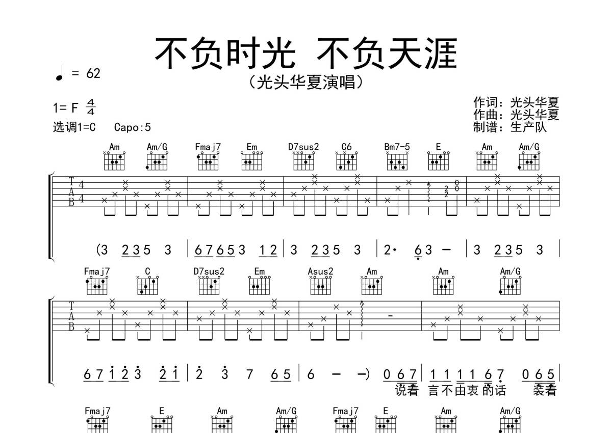 光头华夏《不负时光不负天涯》吉他谱 - C调弹唱六线谱