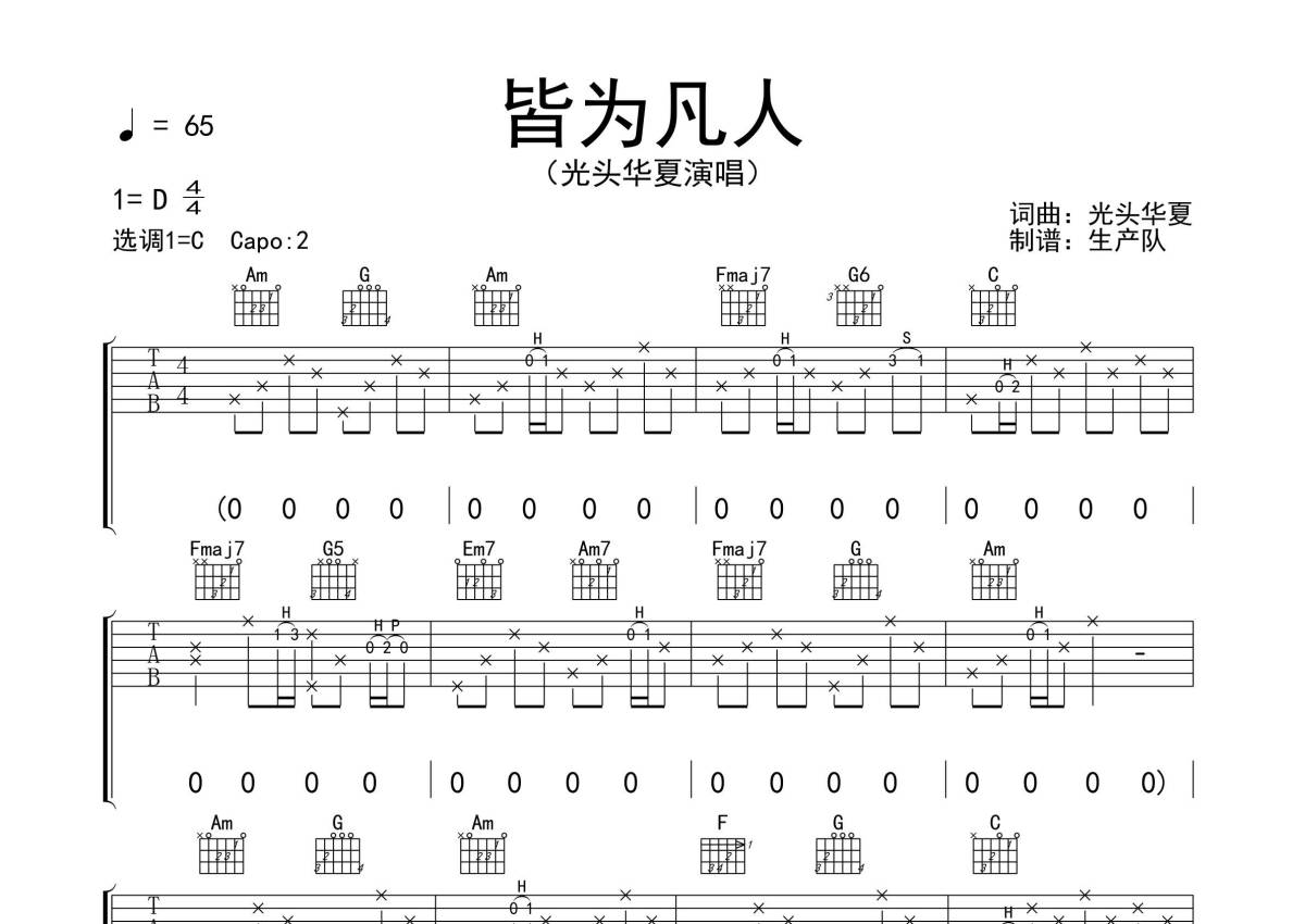 光头华夏《皆为凡人》吉他谱 - C调弹唱六线谱