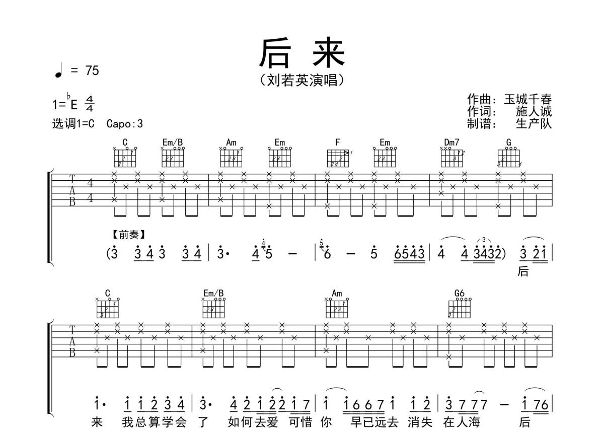 《后来》是刘若英演唱的一首歌曲,拍号为4/4拍,歌曲速度为每分钟75拍,歌曲原调为Eb调,但由于原调指法比较难,为了方便弹奏,本吉他谱采用的是C调指法编配,变调夹3品弹奏即为原调,当然也可以根据自己的音域改变变调夹位置,或者通过改变和弦调性,以方便自己弹奏,这份吉他谱共有四张高清图谱,图谱由 @生产队 编配上传,图谱使用六线谱编配,包含吉他和弦指法、简谱以及歌词部分,使用这份后来吉他谱,可以让你更加方便地掌握这首歌曲的弹唱技巧,快来尝试吧。