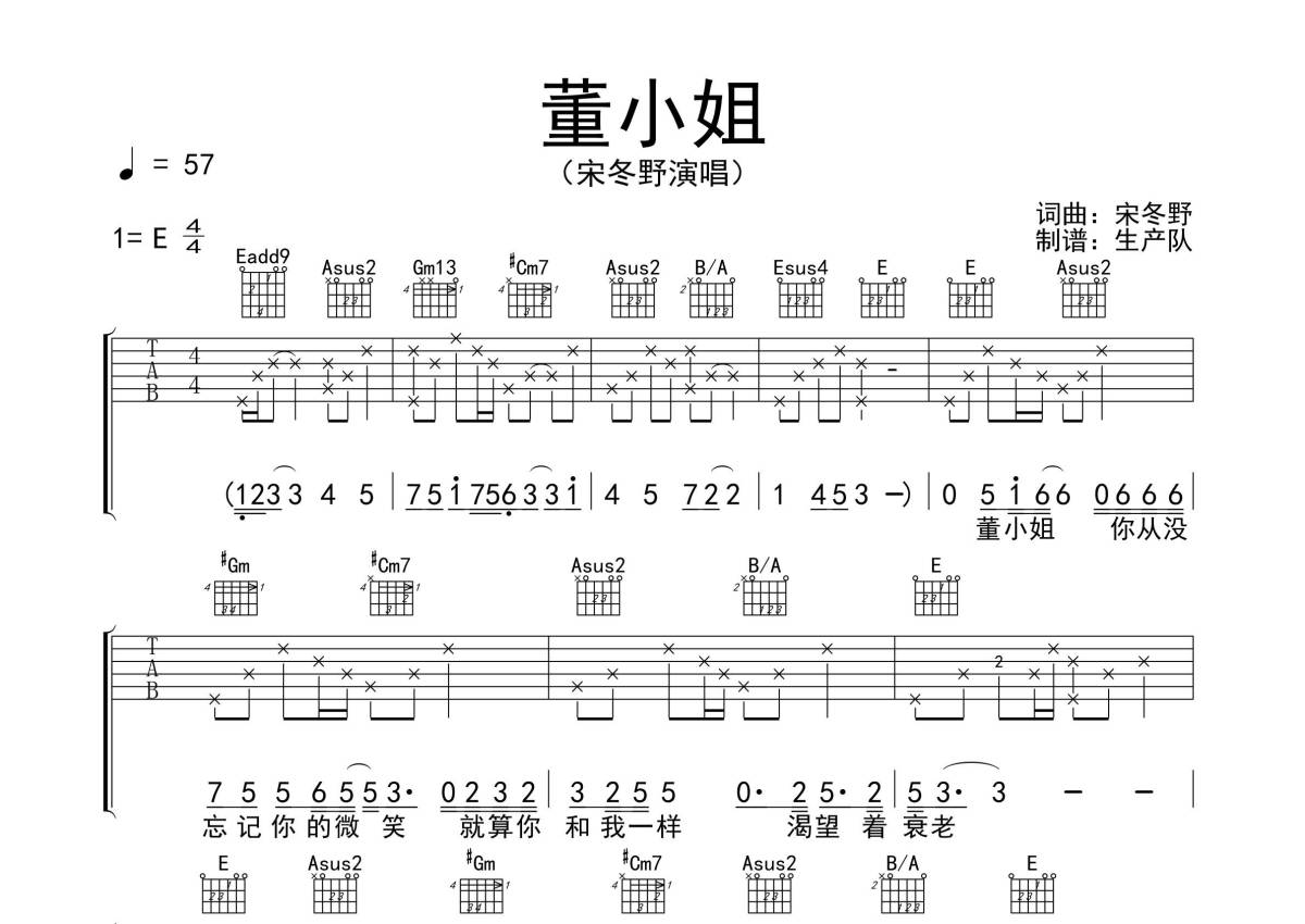 《董小姐》是宋冬野演唱的一首歌曲,拍号为4/4拍,歌曲速度为每分钟57拍,歌曲原调为E调,但由于原调指法比较难,为了方便弹奏,本吉他谱采用的是E调指法编配,演奏时不需要使用变调夹即为原调,这份吉他谱共有三张高清图谱,图谱由 @生产队 编配上传,图谱使用六线谱编配,包含吉他和弦指法、简谱以及歌词部分,使用这份董小姐吉他谱,可以让你更加方便地掌握这首歌曲的弹唱技巧,快来尝试吧。