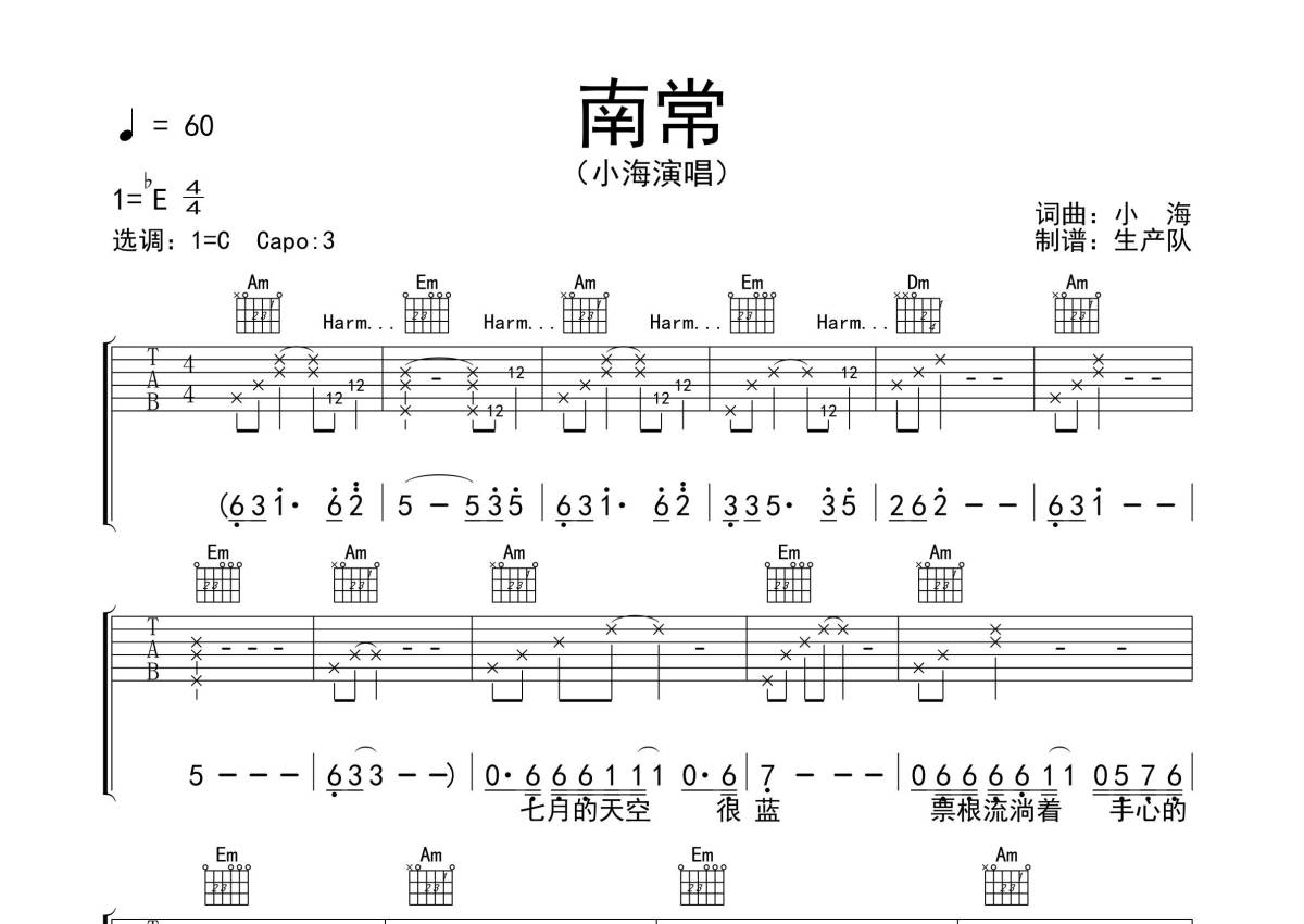 小海《南常》吉他谱 - C调弹唱六线谱