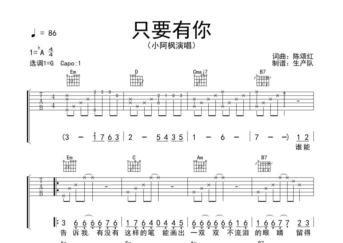 《只要有你》是小阿枫演唱的一首歌曲,拍号为4/4拍,歌曲速度为每分钟86拍,歌曲原调为Ab调,但由于原调指法比较难,为了方便弹奏,本吉他谱采用的是G调指法编配,变调夹1品弹奏即为原调,当然也可以根据自己的音域改变变调夹位置,或者通过改变和弦调性,以方便自己弹奏,这份吉他谱共有三张高清图谱,图谱由 @生产队 编配上传,图谱使用六线谱编配,包含吉他和弦指法、简谱以及歌词部分,使用这份只要有你吉他谱,可以让你更加方便地掌握这首歌曲的弹唱技巧,快来尝试吧。