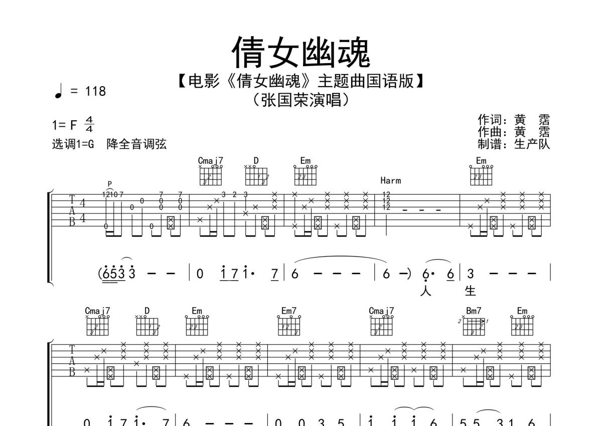 《倩女幽魂》是国语版演唱的一首歌曲,国语版,拍号为4/4拍,歌曲速度为每分钟118拍,歌曲原调为F调,但由于原调指法比较难,为了方便弹奏,本吉他谱采用的是G调指法编配,这份吉他谱共有三张高清图谱,图谱由 @生产队 编配上传,图谱使用六线谱编配,包含吉他和弦指法、简谱以及歌词部分,使用这份倩女幽魂吉他谱,可以让你更加方便地掌握这首歌曲的弹唱技巧,快来尝试吧。