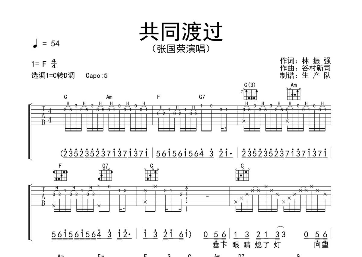 《共同渡过》是张国荣演唱的一首歌曲,拍号为4/4拍,歌曲速度为每分钟54拍,歌曲原调为F调,但由于原调指法比较难,为了方便弹奏,本吉他谱采用的是C调指法编配,变调夹5品弹奏即为原调,当然也可以根据自己的音域改变变调夹位置,或者通过改变和弦调性,以方便自己弹奏,这份吉他谱共有三张高清图谱,图谱由 @生产队 编配上传,图谱使用六线谱编配,包含吉他和弦指法、简谱以及歌词部分,使用这份共同渡过吉他谱,可以让你更加方便地掌握这首歌曲的弹唱技巧,快来尝试吧。