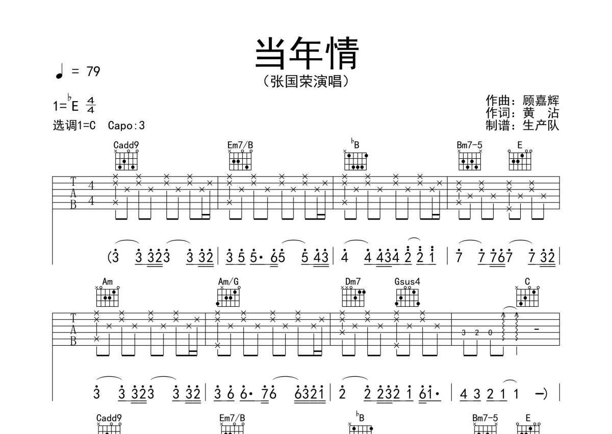 《当年情》是张国荣演唱的一首歌曲,拍号为4/4拍,歌曲速度为每分钟79拍,歌曲原调为Eb调,但由于原调指法比较难,为了方便弹奏,本吉他谱采用的是C调指法编配,变调夹3品弹奏即为原调,当然也可以根据自己的音域改变变调夹位置,或者通过改变和弦调性,以方便自己弹奏,这份吉他谱共有三张高清图谱,图谱由 @生产队 编配上传,图谱使用六线谱编配,包含吉他和弦指法、简谱以及歌词部分,使用这份当年情吉他谱,可以让你更加方便地掌握这首歌曲的弹唱技巧,快来尝试吧。