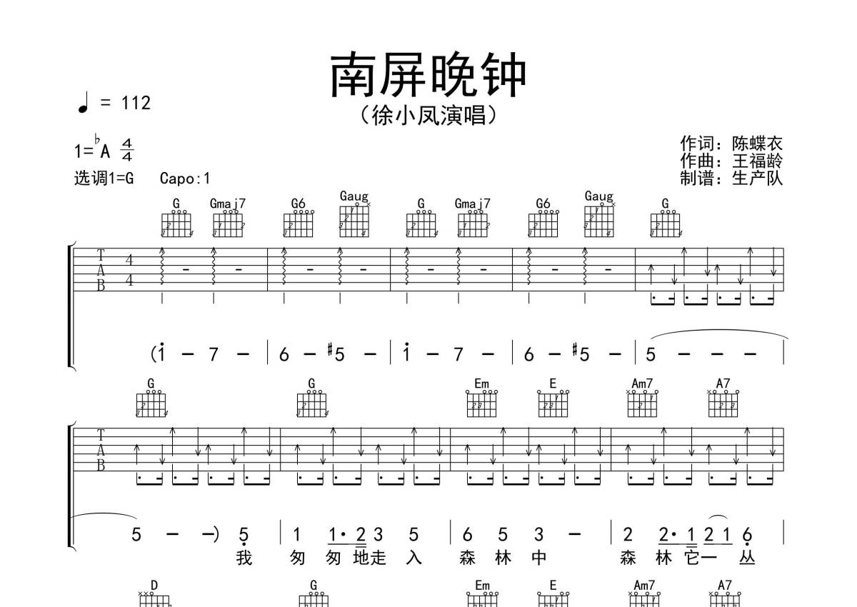 《南屏晚钟》是徐小凤演唱的一首歌曲,拍号为4/4拍,歌曲速度为每分钟112拍,歌曲原调为Ab调,但由于原调指法比较难,为了方便弹奏,本吉他谱采用的是G调指法编配,变调夹1品弹奏即为原调,当然也可以根据自己的音域改变变调夹位置,或者通过改变和弦调性,以方便自己弹奏,这份吉他谱共有三张高清图谱,图谱由 @生产队 编配上传,图谱使用六线谱编配,包含吉他和弦指法、简谱以及歌词部分,使用这份南屏晚钟吉他谱,可以让你更加方便地掌握这首歌曲的弹唱技巧,快来尝试吧。
