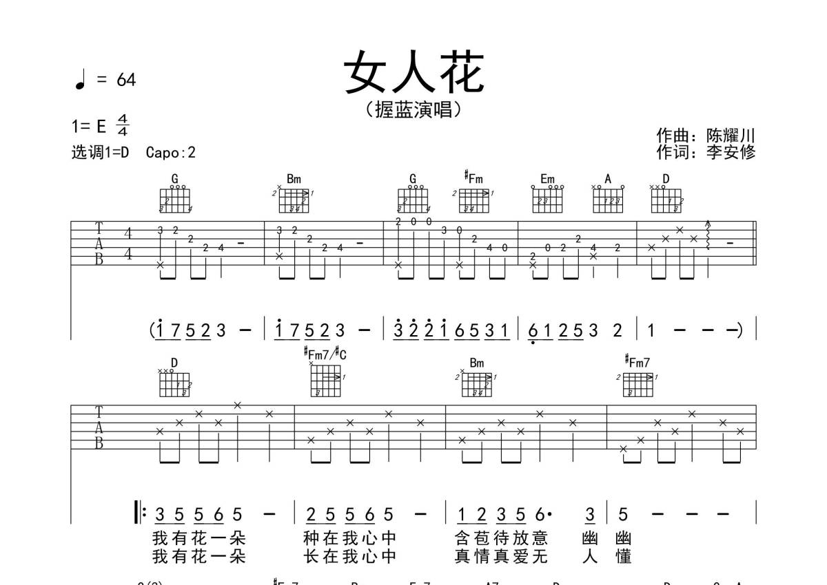 《女人花》是握蓝演唱的一首歌曲,拍号为4/4拍,歌曲速度为每分钟64拍,歌曲原调为E调,但由于原调指法比较难,为了方便弹奏,本吉他谱采用的是D调指法编配,变调夹2品弹奏即为原调,当然也可以根据自己的音域改变变调夹位置,或者通过改变和弦调性,以方便自己弹奏,这份吉他谱共有三张高清图谱,图谱由 @生产队 编配上传,图谱使用六线谱编配,包含吉他和弦指法、简谱以及歌词部分,使用这份女人花吉他谱,可以让你更加方便地掌握这首歌曲的弹唱技巧,快来尝试吧。