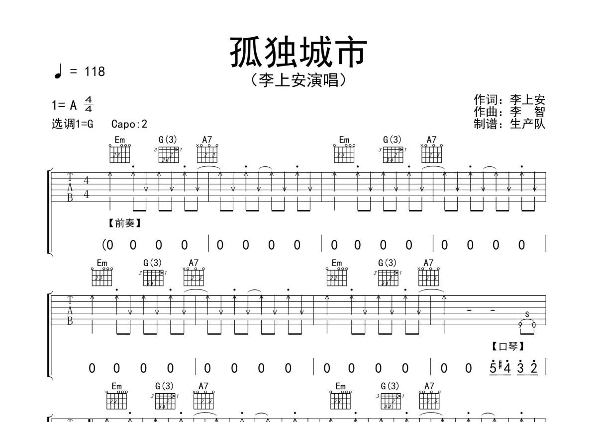 李上安《孤独城市》吉他谱 - G调弹唱六线谱