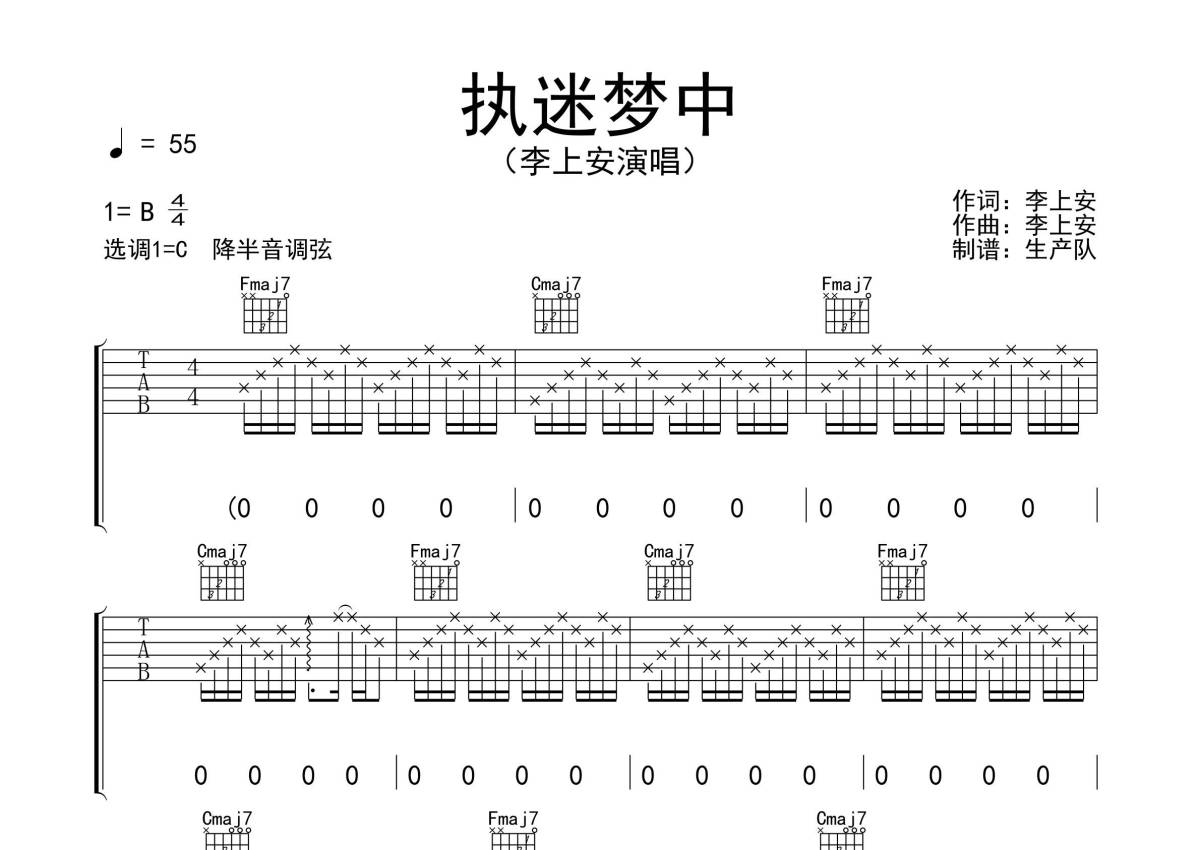 《执迷梦中》是李上安演唱的一首歌曲,拍号为4/4拍,歌曲速度为每分钟55拍,歌曲原调为B调,但由于原调指法比较难,为了方便弹奏,本吉他谱采用的是C调指法编配,降半音调弦弹奏即为原调,当然也可以根据自己的音域决定是否调弦,这份吉他谱共有三张高清图谱,图谱由 @生产队 编配上传,图谱使用六线谱编配,包含吉他和弦指法、简谱以及歌词部分,使用这份执迷梦中吉他谱,可以让你更加方便地掌握这首歌曲的弹唱技巧,快来尝试吧。