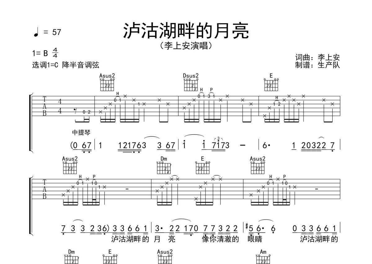 《泸沽湖畔的月亮》是李上安演唱的一首歌曲,拍号为4/4拍,歌曲速度为每分钟57拍,歌曲原调为B调,但由于原调指法比较难,为了方便弹奏,本吉他谱采用的是C调指法编配,降半音调弦弹奏即为原调,当然也可以根据自己的音域决定是否调弦,这份吉他谱共有三张高清图谱,图谱由 @生产队 编配上传,图谱使用六线谱编配,包含吉他和弦指法、简谱以及歌词部分,使用这份泸沽湖畔的月亮吉他谱,可以让你更加方便地掌握这首歌曲的弹唱技巧,快来尝试吧。
