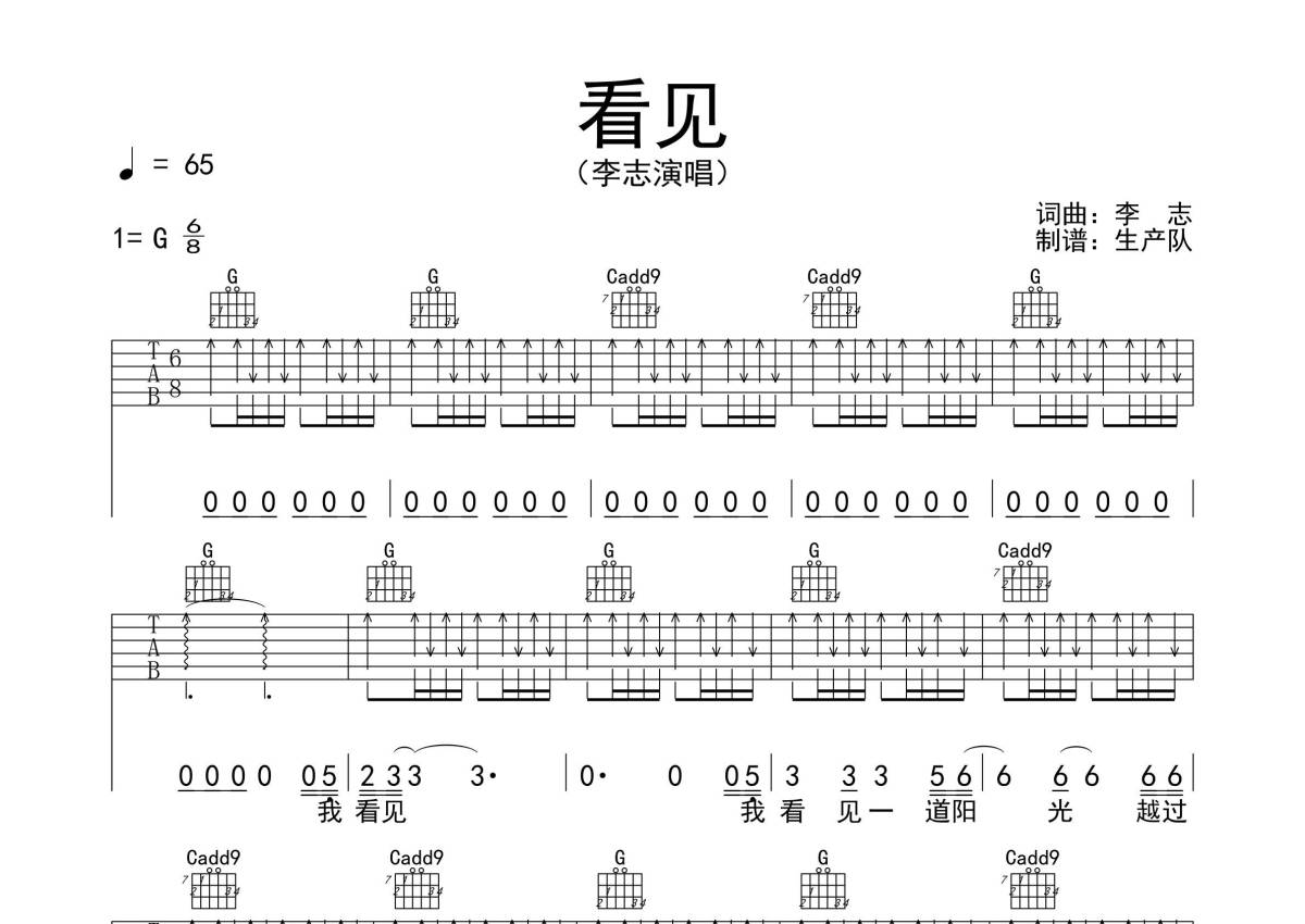 《看见》是李志演唱的一首歌曲,拍号为6/8拍,歌曲速度为每分钟65拍,歌曲原调为G调,本吉他谱采用的是G调指法编配,演奏时不需要使用变调夹即为原调,这份吉他谱共有三张高清图谱,图谱由 @生产队 编配上传,图谱使用六线谱编配,包含吉他和弦指法、简谱以及歌词部分,使用这份看见吉他谱,可以让你更加方便地掌握这首歌曲的弹唱技巧,快来尝试吧。