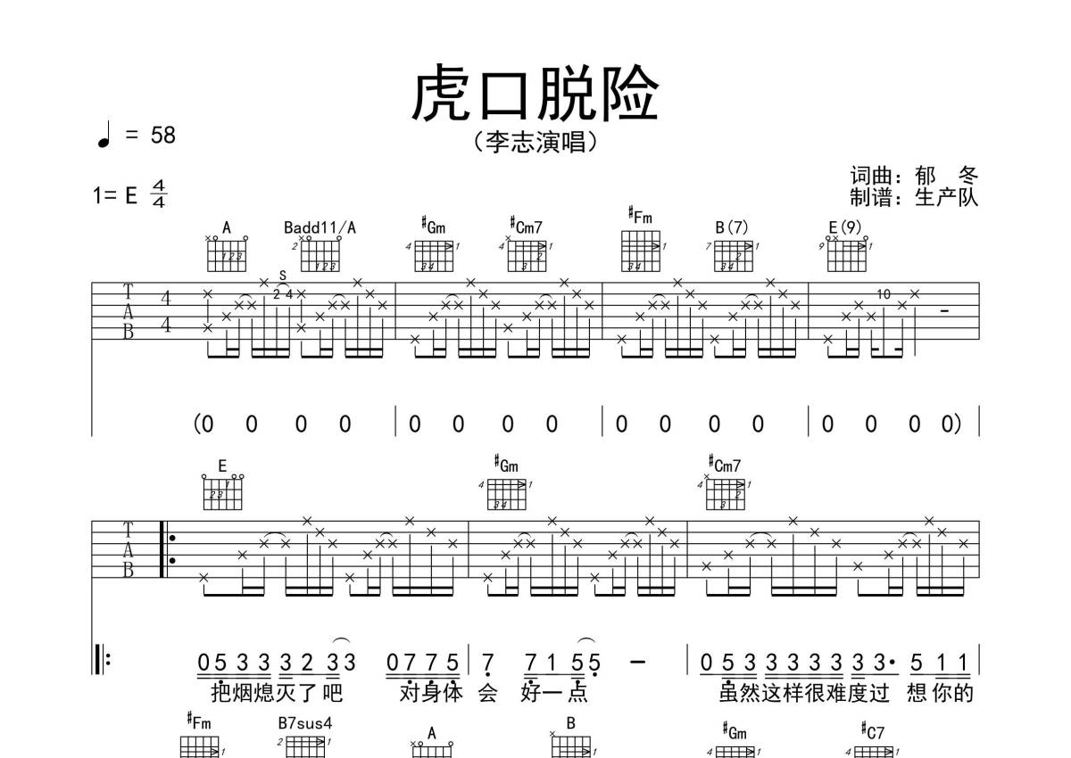 《虎口脱险》是李志演唱的一首歌曲,拍号为4/4拍,歌曲速度为每分钟58拍,歌曲原调为E调,但由于原调指法比较难,为了方便弹奏,本吉他谱采用的是E调指法编配,演奏时不需要使用变调夹即为原调,这份吉他谱共有三张高清图谱,图谱由 @生产队 编配上传,图谱使用六线谱编配,包含吉他和弦指法、简谱以及歌词部分,使用这份虎口脱险吉他谱,可以让你更加方便地掌握这首歌曲的弹唱技巧,快来尝试吧。