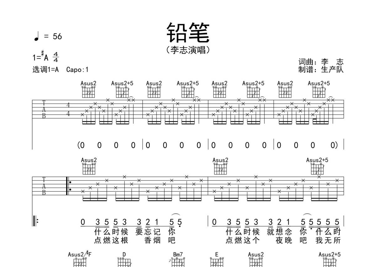 李志《铅笔》吉他谱 - A调弹唱六线谱
