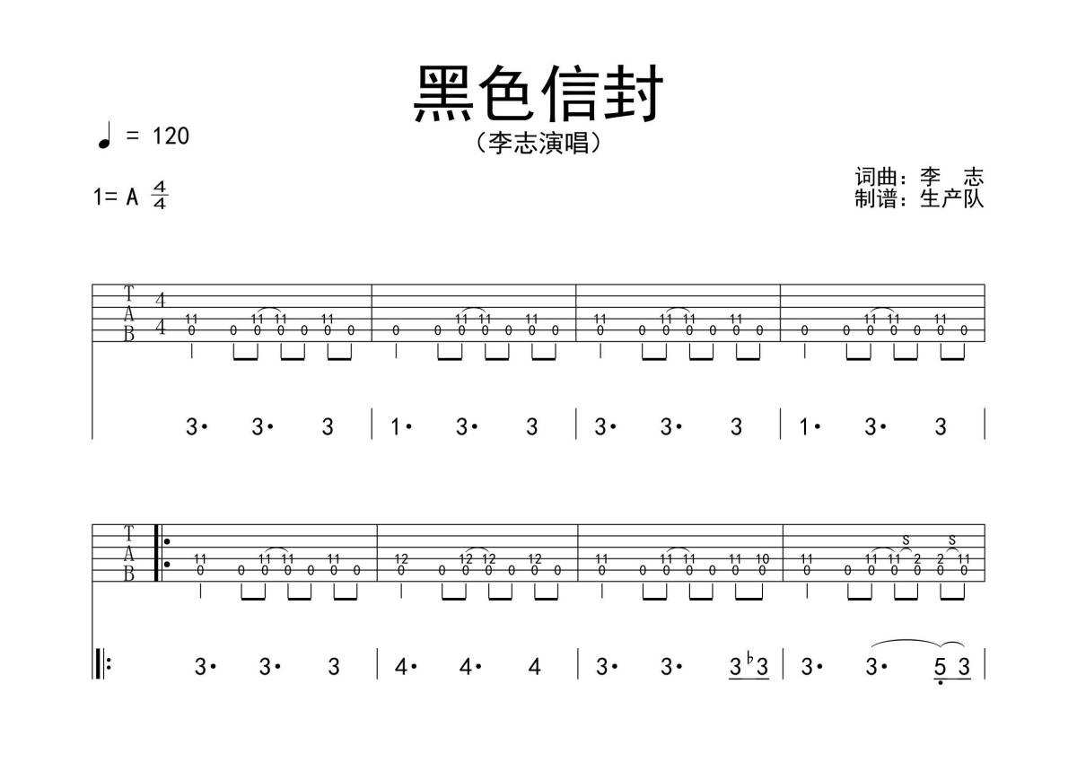 《黑色信封》是李志演唱的一首歌曲,拍号为4/4拍,歌曲速度为每分钟120拍,歌曲原调为A调,但由于原调指法比较难,为了方便弹奏,本吉他谱采用的是A调指法编配,演奏时不需要使用变调夹即为原调,这份吉他谱共有五张高清图谱,图谱由 @生产队 编配上传,图谱使用六线谱编配,包含吉他和弦指法、简谱以及歌词部分,使用这份黑色信封吉他谱,可以让你更加方便地掌握这首歌曲的弹唱技巧,快来尝试吧。